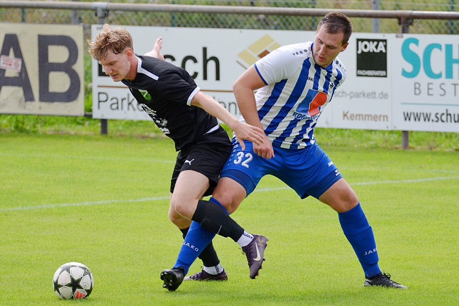 Sich selbst zu oft im Weg stand der SV Dörfleins am Sonntag in seinem Heimspiel gegen die SpVgg Ebing, das bei weitem nicht so lief, wie sich Pascal Seidelmann und Co. sich das nach dem besten Saisonstart seit 21 Jahren erhofft hatten. Schon das Gegentor zum 0:1 war vermeidbar, hätte Patrick Eberlein einen weiten Abschlag unter Bedrängnis ins Seiten- statt ins Toraus gespielt. Aus dem überflüssigen Eckball resultierte der Rückstand in der 8. Minute, nachdem Christoph Fuchs aus kurzer Distanz eingeköpft hatte. Zwar bewegte der SVD von Beginn an häufiger den Ball und versuchte offensiv durchaus, Torgefahr auszustrahlen, jedoch machten sich die Grünweißen das Leben durch zahlreiche individuelle Fehler auch immer wieder ungemein schwer. Ebing antizipierte aber auch gut, stellte früh die Laufwege zu und übte damit entscheidend Druck auf die Abwehrkette der Gastgeber aus. Nichtsdestotrotz gelang es schließlich Andreas Leier, das Spiel nach perfektem Zuspiel von Pascal Rückel wieder auszugleichen. Sein Volley ins kurze, obere Eck war nicht zu halten, somit stand es nach 25 Minuten 1:1. Pünktlich zur Halbstundenmarke drehte Dörfleins die Partie dann sogar. Nico Bayer lief in der Mitte ein, nachdem sich Tim Kaufer über die rechte Außenbahn gegen zwei Gegenspieler durchgesetzt hatte. Etwas Glück war dabei, als Bayers Schuss die Unterkante der Latte touchierte, um anschließend zum 2:1 hinter die Linie zu springen. Ärgerlich war für den SVD kurz danach eine knappe Abseitsposition von Pascal Rückel, der in der 32. Minute vielversprechend alleine in Richtung Ebinger Tor losgesprintet war – die Entscheidung des Linienrichters schien jedoch richtig gewesen zu sein. Bitter allerdings war es, dass sich der SVD genau im Gegenzug dann den erneuten Ausgleich einfing. Florian Eiermann brachte das Leder abgefälscht im Dörfleinser Tor unter, sodass es nun 2:2 stand (33.). Der SVD startete nach diesem Gegentor noch einmal so etwas wie eine Schlussoffensive in der ersten Halbzeit. Erst hatte Spielertrainer Pascal Seidelmann in der 34. Minute Pech, dass sein verdeckter Schuss aus 16 Metern von Nico Bayer abgeblockt wurde, dann scheiterte Andreas Leier aus acht Metern zentraler Position trotz viel Freiraum (38.). Auch ein Kopfball von Pascal Rückel in der 45. Minute nach einem kurzen Eckball fand sein Ziel nicht im Tor – in dieser Phase hätte das 3:2 längst fallen müssen. Stattdessen war es aber die Germania, die den insgesamt fünften Treffer dieses Nachmittags erzielen sollte. Nach einem sauber zu Ende gespielten Konter schob Fabian Höppel in der Schlussminute der ersten Hälfte zum 2:3 ein. Doch immer noch war nicht Halbzeit, denn Ebing bekam nach einem Abwehrbock der Dörfleinser sogar noch die Chance aufs Vierte, scheiterten aber an Patrick Eberlein, der die Pranke ausfuhr und damit den knappen Pausenrückstand für seine Jungs festhielt (45+2.).