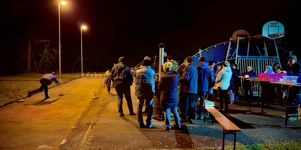 Auf der Eisstockbahn hinter dem Hauptplatz der Fußballer stand das gemeinsame Schieben im Mittelpunkt. Glühwein und Bratwürste vom Grill luden zum Verweilen ein, während Feuertrommeln für eine gemütliche Atmosphäre und angenehme Wärme und sorgten.