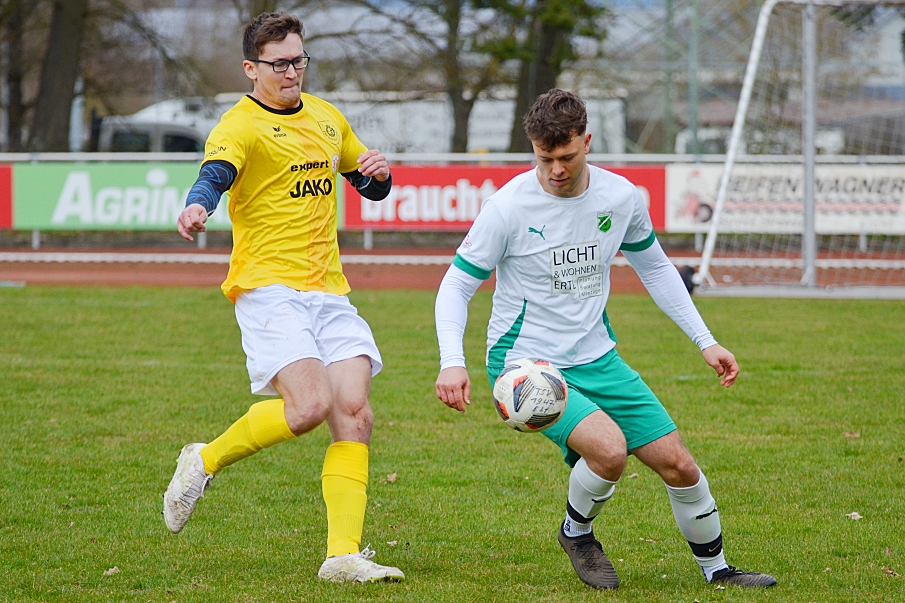 Die Begegnung begann mit leichten Vorteilen für die Hausherren aus Ebensfeld, die in der sechsten Minute den ersten Distanzschuss absetzten. Eine Viertelstunde später dann der nächste Versuch des TSV, diesmal im Strafraum links am Tor vorbei. Die beste Gelegenheit für die Gastgeber ereignete sich in der 32. Minute, als der Ball aus zentraler Position an die Latte sprang. Von Dörfleins 2 war offensiv derweil wenig zu sehen. Bis auf einen gut getretenen Abschluss von Tim Waltrapp in der 42. Minute konnte keine nennenswerte Torchance auf dem Chancenzettel vermerkt werden.